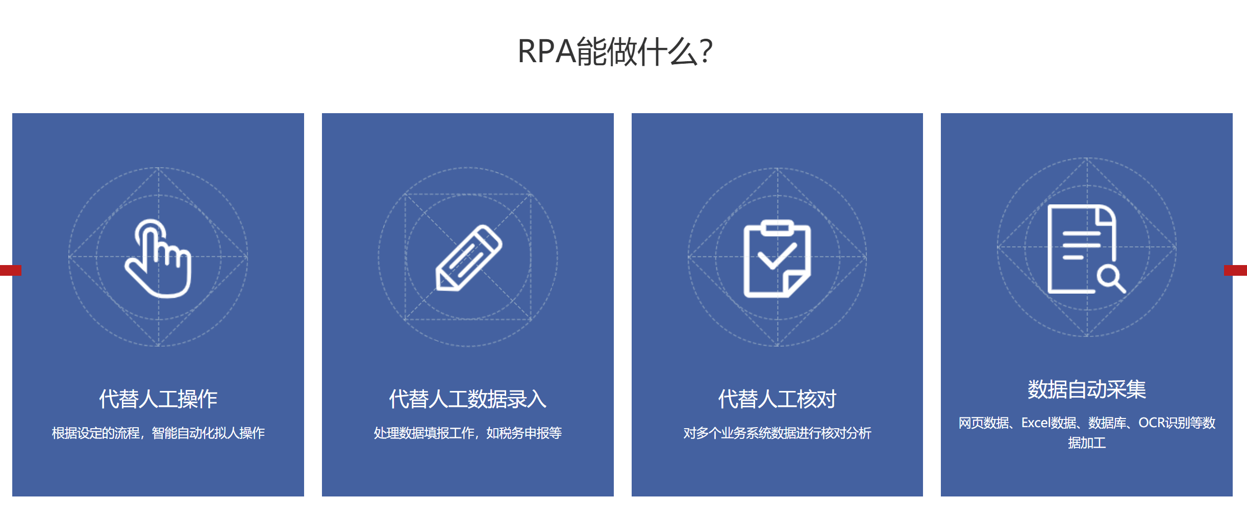 指用软件机器人实现业务处理的自动化,是以“模拟人”的方式进行业务操作,它可以帮助企业处理很多重复的、规则固定的、繁琐的流程作业。